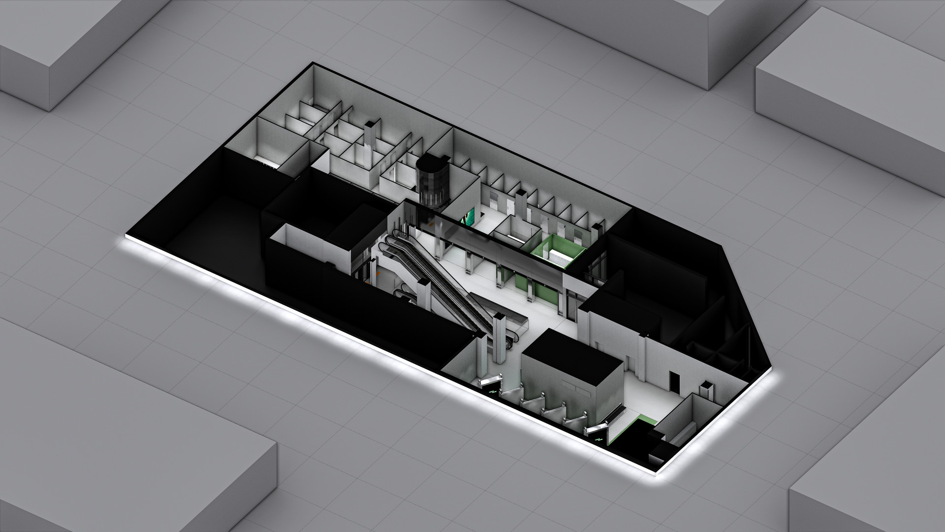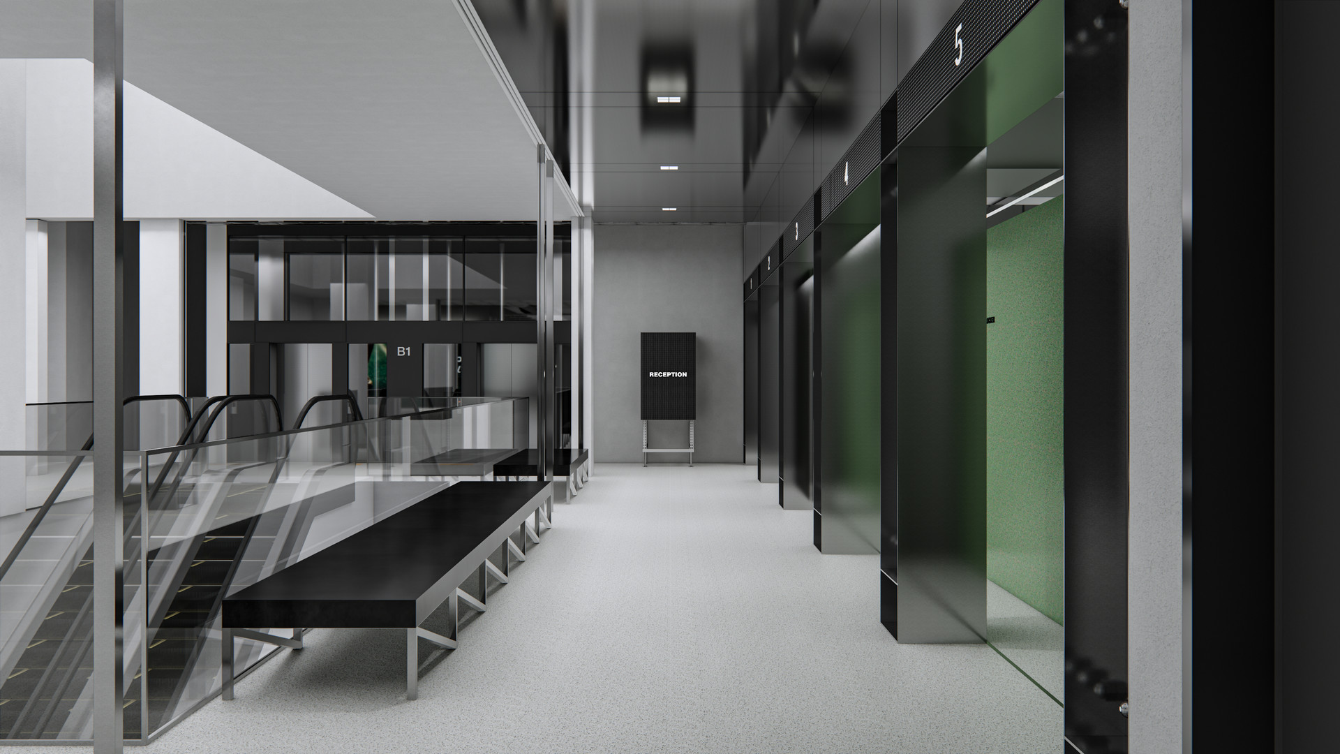 에스컬레이터를 통해 들어선 고객은 시선의 흐름에 따라 자연스럽게 리셉션–파우더룸–다이어트센터–내과로 이어집니다. 이 과정에서 건축적 시야를 활용하여 다음 공간이 직관적으로 인지되도록 하였습니다.