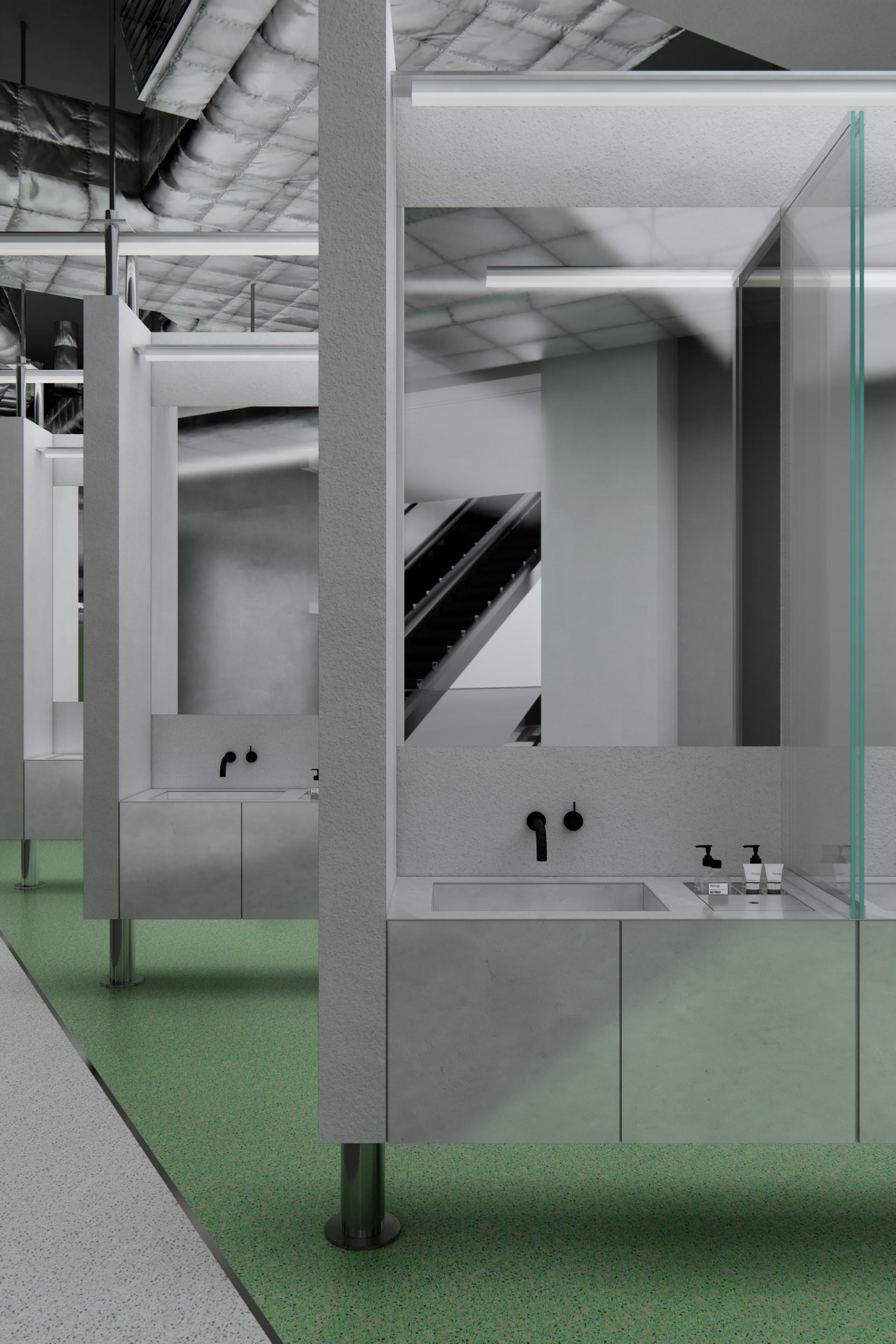 Upon entering via the escalator, clients are naturally guided along the sequence of reception – powder room – diet clinic – internal medicine practice, following the direction of their gaze. Architectural sightlines are carefully arranged so that each subsequent space can be intuitively perceived.
